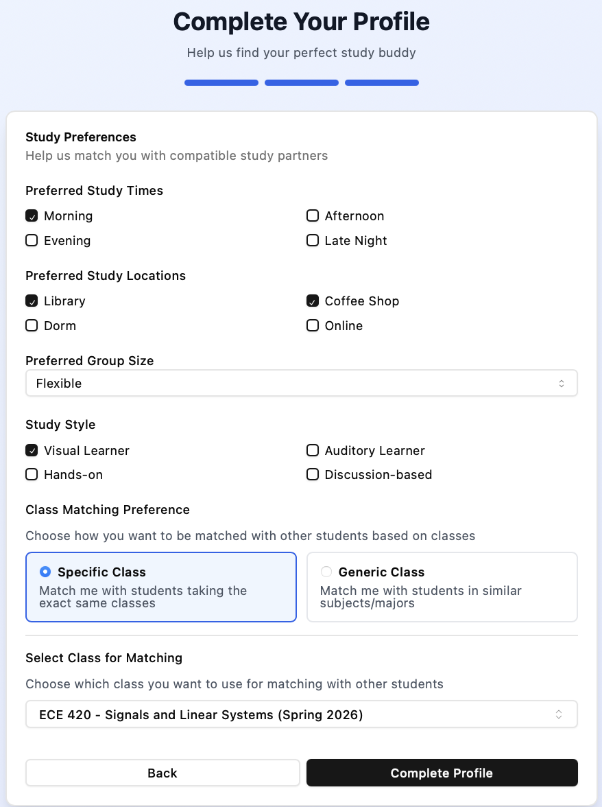 Our algorithm finds compatible study partners based on shared classes and preferences